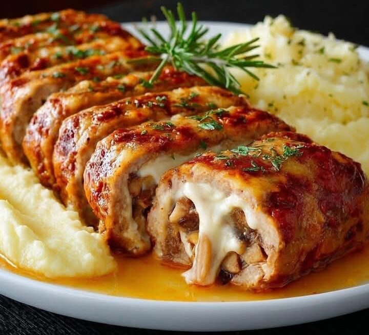 Baked Stuffed Meat Roll with Mushroom Mashed Potatoes