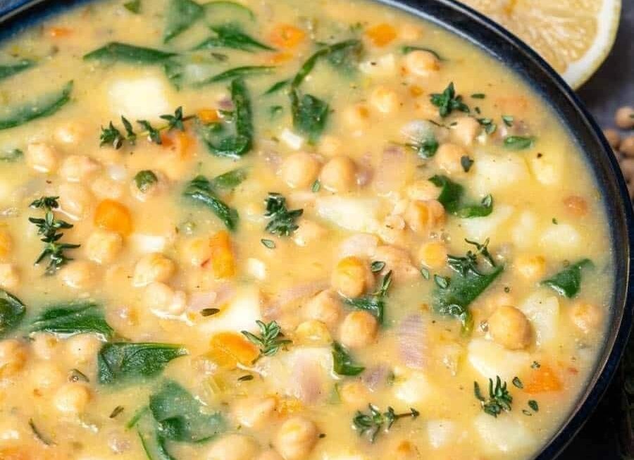 - Add the chickpeas, potatoes and vegetable stock and bring to a boil. Lower the heat, cover the pot with a lid and simmer for 15 minutes.